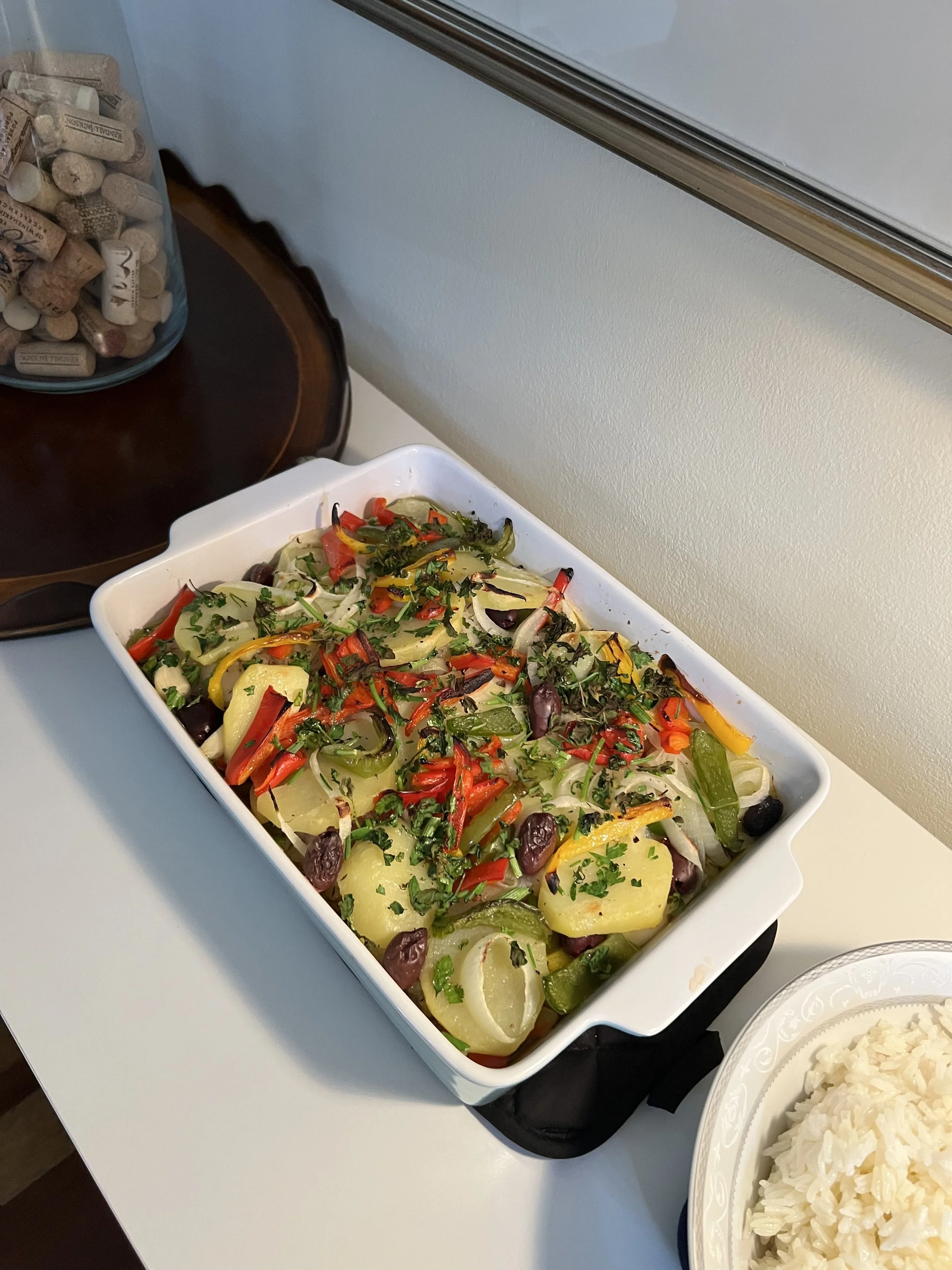 Once all the layers are assembled, generously drizzle with olive oil (essential). Add the garlic cloves between the layers for extra aroma and flavor, and don’t forget the olives.