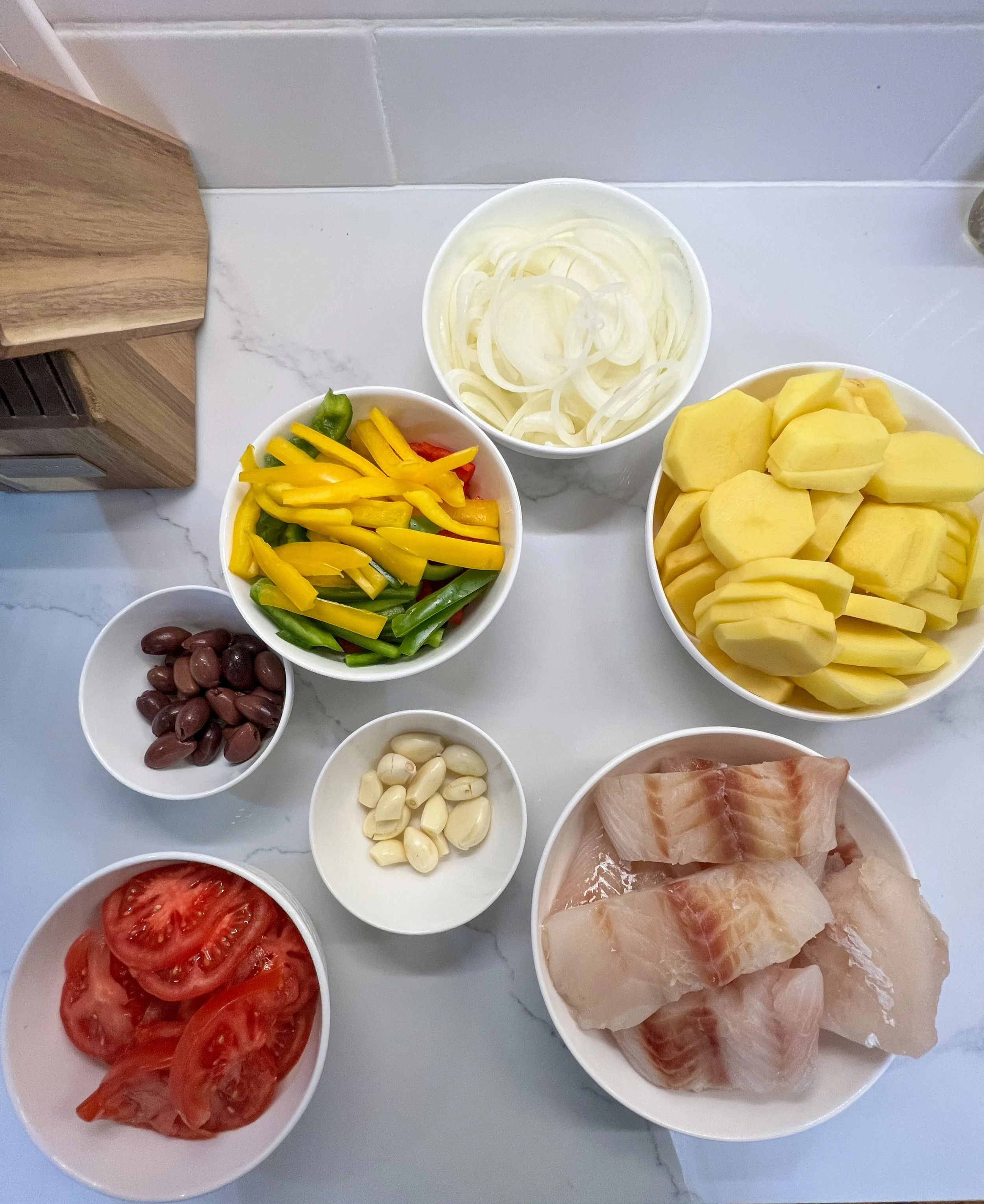 In a large pot, bring water to a boil. Once boiling, add the codfish and cook for no more than 1 minute, then remove. In the same water, add the potatoes and cook for about 5 minutes (or until al dente), then remove. Next, add the onion and cook for 1–2 minutes, then remove. Repeat the same process with the bell peppers. This step is important to infuse all the ingredients with the flavor of the codfish and also to partially cook the potatoes, since they take longer than the fish.