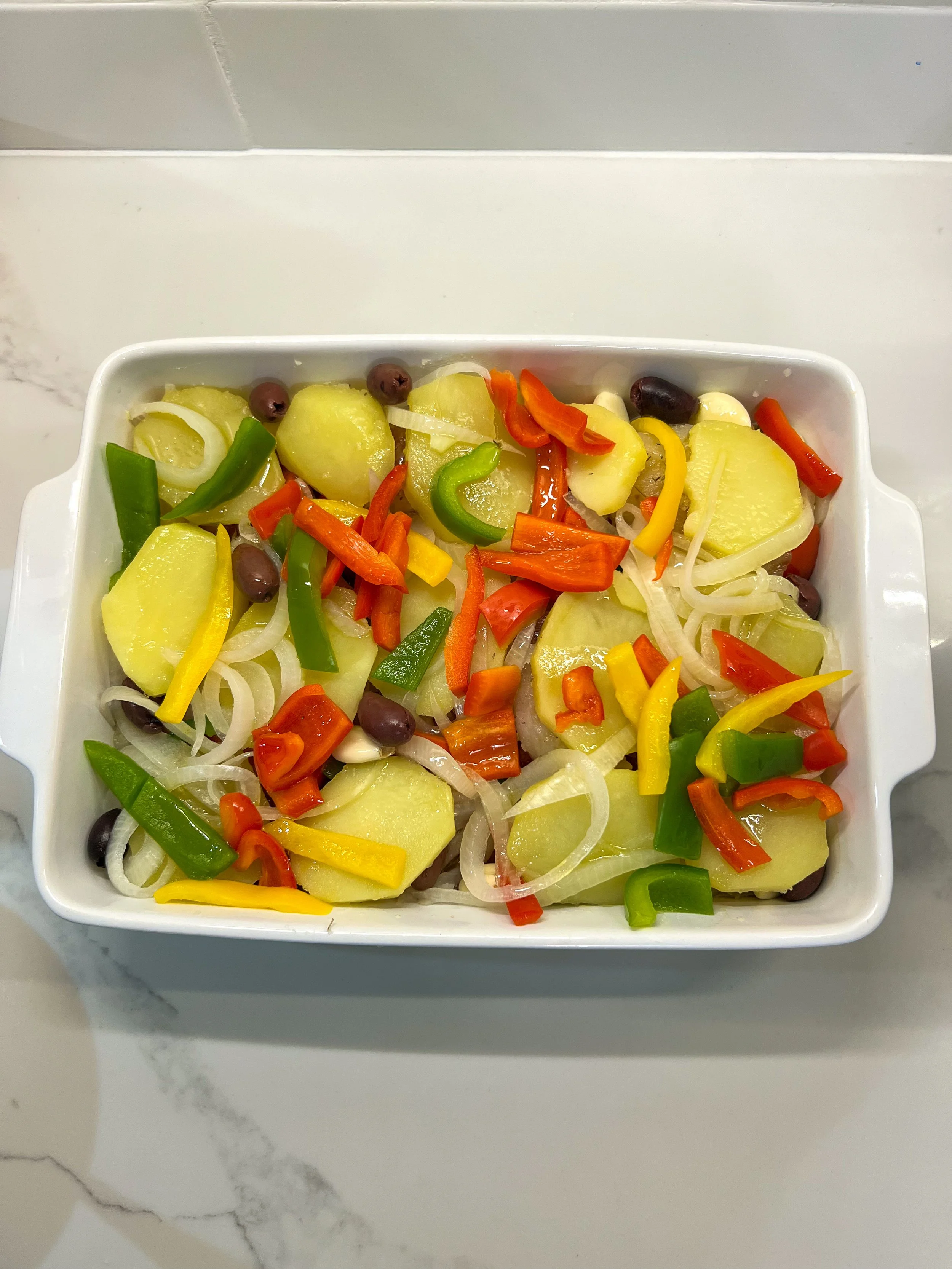 In a baking dish, begin layering the ingredients. Start with a bed of onions, followed by potatoes, tomatoes, bell peppers, and then the codfish. Season the cod with salt, pepper, and thyme (to taste). On top of the fish, repeat the process by adding another layer of potatoes, onions, bell peppers, and so on.