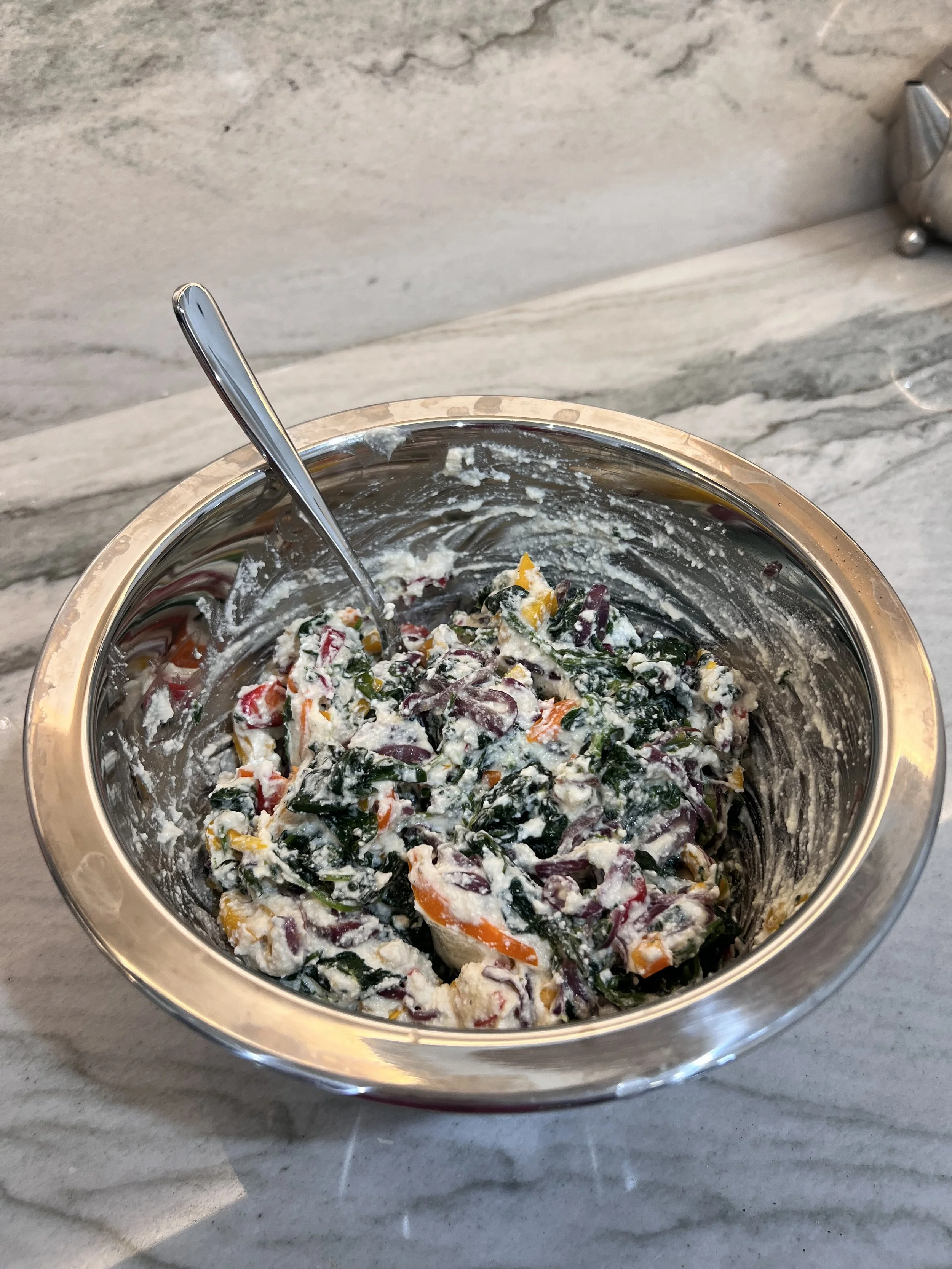 In a large bowl, mix the ricotta cheese with the caramelized onion, diced bell peppers, and sautéed spinach. Season with salt and black pepper.