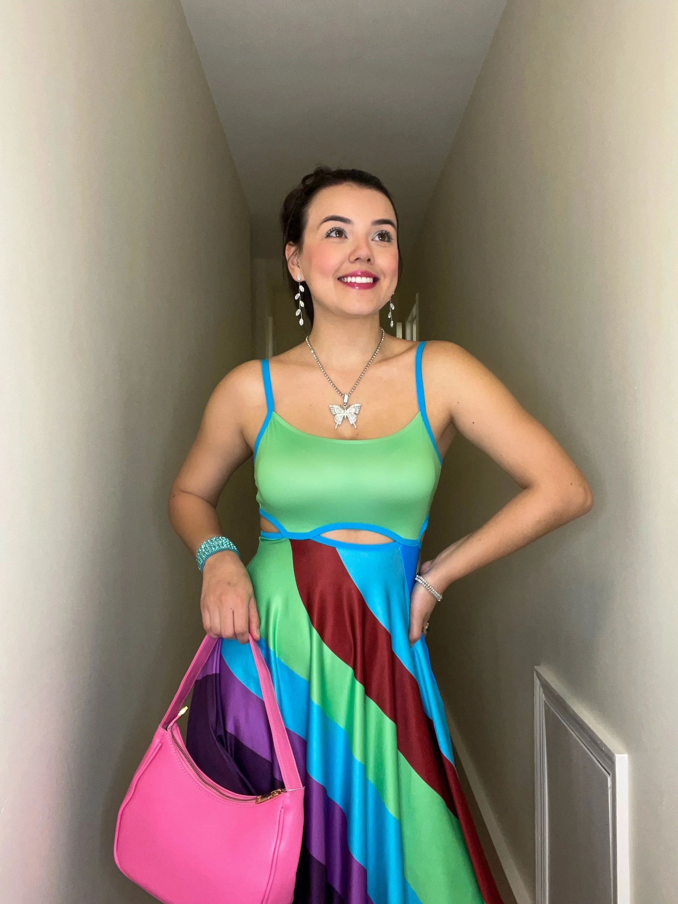 Como o filme também se passa no final dos anos 80, decidi criar uma discoteca no andar de baixo da casa. A personagem, Jenna Rink, tem sua festa de aniversário no ‘basement’ de sua casa. Então, achamos que a ideia super combinaria. Criamos um ambiente bem aconchegante com balões de disco balls e DJ. Esse foi o momento em que troquei para o segundo look da festa. O icônico vestido colorido.